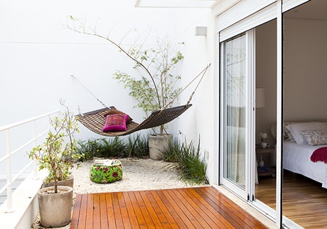 Espaço pequeno? A solução é verticalizar! Fixe os vasos diretamente nas paredes ou crie um painel aonde você possa pendurar os vasinhos.  Isso lhe dá espaço para colocar uma rede ou um banco, ou até mesmo um futton no chão para a criançada brincar.